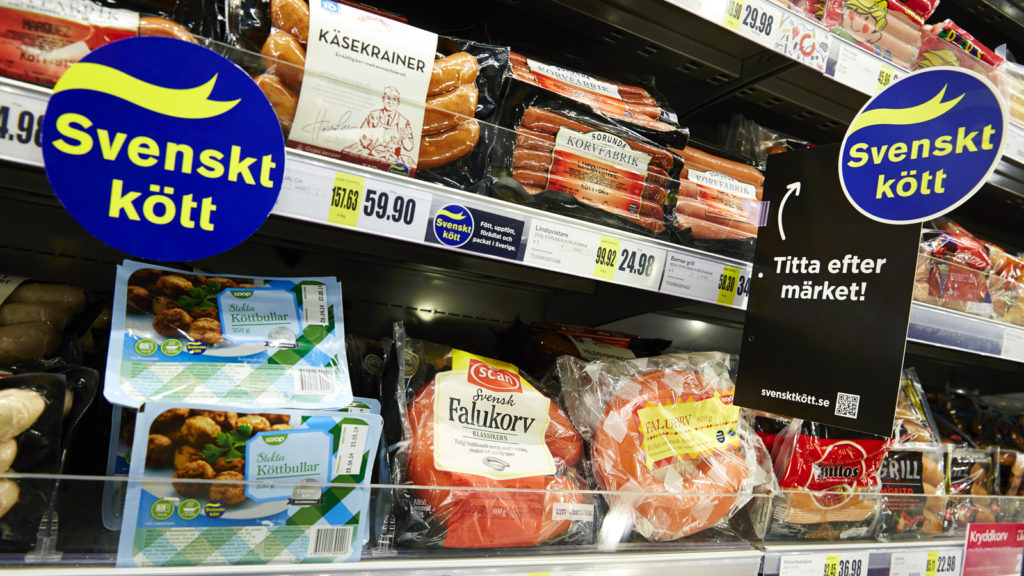 Svenskt kött erbjuder nu skyltmaterial för butik. Det är lättanvända hyllkantsetiketter med texten ”Fött, uppfött, slaktat, styckat, förädlat och förpackat i Sverige”, samt vippor med märket Svenskt kött.