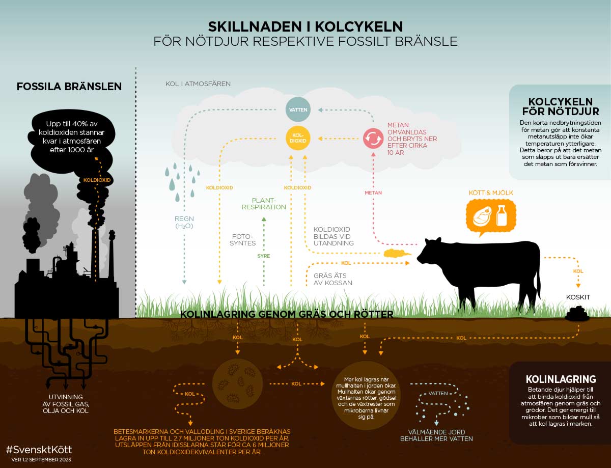 De gröna kolatomerna ingår i ett kretslopp som börjar med fotosyntesen, där växterna ”andas in” koldioxid från luften och ger ifrån sig syre. Koldioxiden binds in i växten exempelvis gräs och gör att gräset växer. När ett djur sen äter gräset hamnar en del av kolet i gödseln, en del binds in i djuret för att växa eller producera mjölk och en del rapas ut som metan. Metanet är en starkare växthusgas än koldioxid, men bryts också ner snabbare. När metan har varit i luften i ungefär 10 år bryts det ner till koldioxid. Koldioxid som via fotosyntesen kan ”andas in” av växter som träd eller gräs igen.