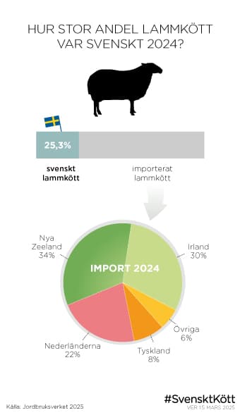 Idag är det mindre än en fjärdedel av lammköttet vi äter som är svenskt. Det mesta av lammköttet som importeras till Sverige kommer från Nya Zeeland och Irland. Det är länder som har en mer omfattande uppfödning av lamm och kraven på djurskydd är lägre, exempelvis har dessa länder en högre användning av antibiotika inom djurhållningen än Sverige. Förutom ett sämre djurskydd innebär det också långa transporter av köttet och mer klimatutsläpp.