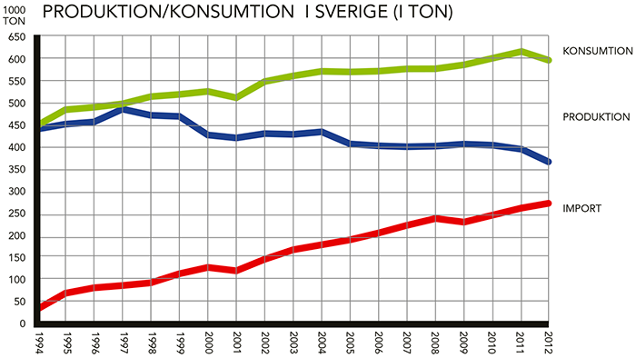Nästan hälften av allt gris, nöt och lammkött som vi äter i Sverige är importerat. Andelen svenskt kött har stadigt minskat sedan vårt inträde i EU, samtidigt som den totala konsumtionen av kött hela tiden ökat.