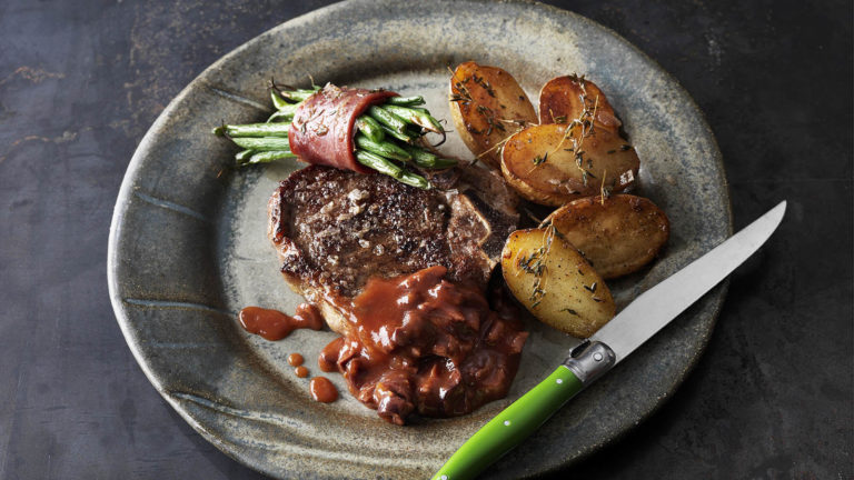 Servera kotletterna med sås, bönknippen och klyftpotatis.