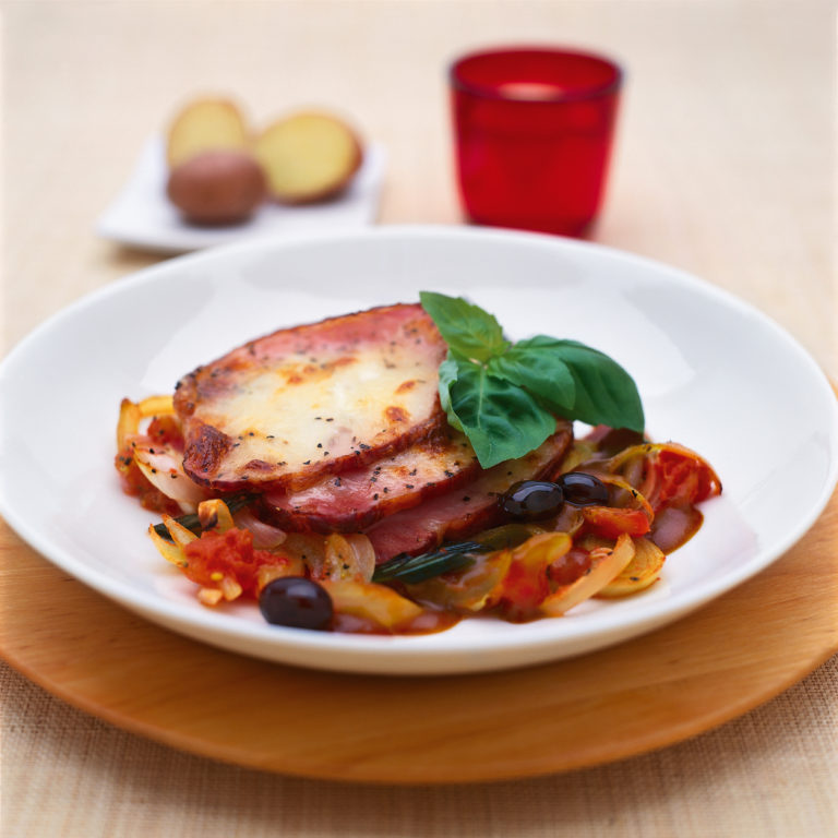 Lägg upp varje kasslerportion på en varm tallrik. Dekorera med oliver och basilika. Servera med ris eller pasta.