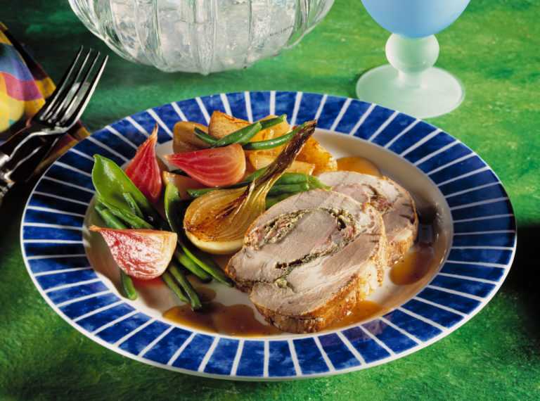 Om du skär upp fläskkarré till en platta, kan du fylla den och rulla ihop den tätt. Då blir det så här fina snäckor när du skär upp köttet efter tillagning.